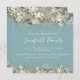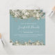 Modern elegant floral bridal shower invitation features a top and bottom border of white and foil flowers, with lush botanical accents. Personalize with your bridal shower details in modern white hand lettered script and traditional sans serif lettering. Invitations reverse to rich matching blue with floral accent.