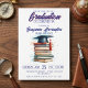 Celebrate your graduate's hard work and academic achievements with this elegant watercolor books and cap graduation celebration invitation. Featuring a beautifully painted stack of classic textbooks topped with a traditional graduation mortarboard and a striking red tassel, this design perfectly captures the essence of scholarly success. Delicate watercolor splashes add an artistic, modern touch to the classic navy blue typography. Whether you are hosting a high school graduation party or a college commencement celebration, this book-themed graduation invite sets the perfect sophisticated tone for your memorable event.