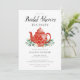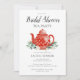 Elegant watercolor bridal shower tea party invitation which can be customized to include your bridal shower details. The back of the invitation features a greenery pattern. The front of the invitation features a watercolor teapot and a bouquet of daisies. The design is sweet and elegant and could be used for any bridal shower tea party at any time of the year.