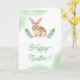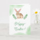 This Easter greeting card features Destei’s brown watercolor bunny with extra long ears, surrounded by green leaves and watercolor splashes on the front. The front text area currently reads "Happy Easter!" and is personalizable, while the inside of the card includes another personalizable area for a longer message and a name. Perfect for spring and Easter, the natural tones and woodland-inspired design bring a festive and inviting touch to your holiday greetings.