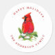 Elegant & personalized Happy Holiday Label/seal featuring watercolor Cardinal in a snow covered pine branch.