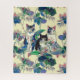 Puzzle in a watercolor-style illustration of three black-and-white cats surrounded by lush, vibrant green foliage, with purple and pink flowers. The composition is dreamy and nature-infused, blending realism with fantasy.