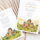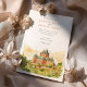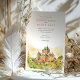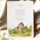 Announce your special day with this exquisite wedding invitation, featuring a stunning watercolor illustration of the iconic Château Frontenac in Québec City, Canada. The front presents the majestic castle-like hotel and the beautiful landscapes around it, rendered in a soft, romantic watercolor style. The building is surrounded by green foliage and flowering accents.