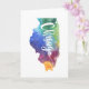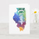 This design features a map of the US State of Illinois featuring the city of Chicago with a multicoloured hand painted watercolor texture. "Chicago" stylized text is added overtop with a star to indicate the location of the city.
