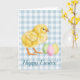 Destei's watercolor baby chick and pastel eggs. The background features a blue gingham pattern. There is also a personalizable text area that now reads: "Happy Easter!" in blue color script font.