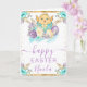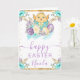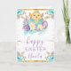 Send warm spring wishes with this cheerful Easter card featuring a sweet yellow chick emerging from a decorated blue egg tied with a bow. Soft pastel florals in purple, teal, and white surround the artwork, while gold accents add a festive seasonal sparkle. The uplifting watercolor palette and charming Easter motifs make this design perfect for sharing holiday joy with friends and family. Personalizable text allows you to add a name or message for a heartfelt, one‑of‑a‑kind greeting.