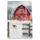 Red barn with green Christmas wreath, snowman, and rustic old fence in snowflakes.