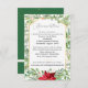Theme Parties' Christmas Wedding accommodations card design features watercolor botanicals in varying shades of holiday green and accented with a pretty watercolor poinsettia and watercolor holly and berries. The traditional serif typography is set in a gold geometric shape with a crisp white background. #ChristmasWedding #HolidayWedding #Wedding