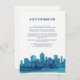 This modern, stylish insert card features a watercolor painted city skyline in navy blue and teal.