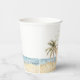 Add a charming coastal touch to your drink station with this personalized paper cup by Redwood & Vine Design Co. The design showcases softly painted palm trees, sandy shore, ocean waves, and three surfboards, paired with customizable event text in a modern serif font. Ideal for tropical, surf, or beach-themed showers, these cups offer convenience and style while coordinating perfectly with other pieces from the coastal stationery suite.