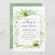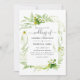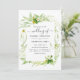 Greenery wedding invitation featuring ferns, wildflowers and strawberries and a sage green watercolor wash background.