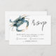 This custom wedding Rehearsal Dinner RSVP design features a watercolor blue crab motif in the upper left corner with modern handwritten script type face spelling out rsvp in lower case script. The text template can be personalized with your desired text or instructions. This design is a lovely choice for coastal weddings with seafood or other nautical themes.