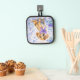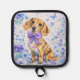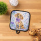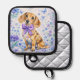 Celebrate the irresistible charm of the beloved dachshund with this delightful doxie-themed oven pot holder. This sweet wiener dog portrait features a long-and-low doxie sitting proudly with a soft, curious expression and soulful eyes that instantly melt hearts. Around the adorable sausage dog, playful watercolor florals bloom in soothing purples and blues, creating a light, airy garden setting.