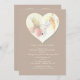 An elegant invitation featuring a watercolor buck in a heart-shape overlay with a pink flower and golden foliage.