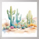 This enchanting poster captures the serene beauty of a desert landscape, rendered in the delicate and fluid medium of watercolor. The artist skilfully employs a palette of soft greens, blues, pinks, and tans, evoking the tranquil and mystical atmosphere of the desert at dawn. The green tinges suggest the rare but resilient vegetation dotting the sandy expanse, while the blues and pinks paint a sky transitioning from the cool pre-dawn hours into the warm embrace of the morning sun. The tan hues ground the piece, representing the endless sands that define the desert's essence. This artwork invites viewers into a peaceful, almost ethereal world, where the vastness of nature and the beauty of its subtle colours speak directly to the soul. Perfect for adding a touch of calm and inspiration to any space, this poster is a testament to the artist's ability to capture the majestic simplicity of the desert through the soft and fluid expressions of watercolor.