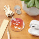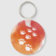 Watercolor dog paw tracks in white, red and orange with paint splatter effect applied to the image. Custom keychains with original design. Gift idea for dog lovers.