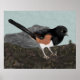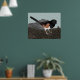 Poster print with my original mixed media image of an Eastern Towhee scratching on the ground among fallen fir needles and twigs. The watercolor bird is mostly black with a white breast and rust-coloured sides. Behind it is a large stone against a pale green grassy background.