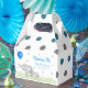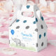 Adorable party event favour box featuring blue and grey dots pattern, watercolor elephants holding a blue balloon and greenery leaves. Perfect for children's birthday, baby shower and more!