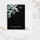 This unique jewelry display card is decorated with watercolor eucalyptus leaves on a black background.