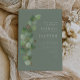 This simple, elegant wedding invitation features a graceful watercolor sprig of green eucalyptus leaves with gold faux glitter stems and gold-coloured berries. Customize the white text with the first names of the bride and groom in serif font and the remaining text in sans serif and handwriting script on a sage green background. The back of the card is solid sage green.