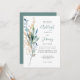 The left-hand edge of this romantic wedding invitation features a bouquet of eucalyptus greenery in blue-green watercolor and gold faux glitter outlines. The customizable text combines handwriting, copperplate and italic fonts in blue-green and charcoal gray on a white background. The reverse side is a matching shade of solid blue-green.