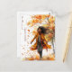 Postcard featuring a watercolor illustration of trees with falling leaves in vibrant, rustic orange, yellow and red hues. A woman in casual fall apparel walking in the foreground swept up in the autumn wind and a swirl of falling leaves. The script Fall Mood to the left of the images in a colour to match the illustration.