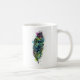a colourful peacock feather tattoo design in ink and watercolors on a coffee mug