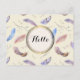 A pattern made up of watercolor feathers with varying stripes, spots and plain designs with colours in blue, pink, orange and brown colours. Branches and twigs with leaves and pussy willow buds also decorate the design. The background is a solid cream colour. A circle with a gold gradient border and a cream centre says "hello" but you can customize it to say whatever you like.