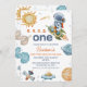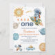 Cute first trip around the sun outer space first birthday invitation for a baby boy featuring a cute astronaut riding a spaceship, various plants, sun and stars. This first trip around the sun 1st birthday invitation is ideal for a space themed first birthday.