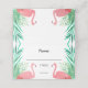 Charming wedding place card with a couple of flamingos and bright greenery, filled with printed watercolor texture, on both the cover and the back. The inside features a matching tropical leaf pattern in pink and white.