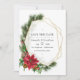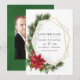 Trendy rustic christmas wedding save the date with gold geometric frame and handwriting typography featuring sleigh bells, poinsettia flowers, holly, mistletoe and pine.