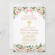 Elegant Watercolor Pink White Floral Baptism Invitation includes pink roses, white flowers and greenery. Gold Cross. Pink Blush Bow Ribbon.
