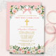 Elegant Watercolor Pink White Floral First Holy Communion Invitation includes pink roses, white flowers and greenery. Gold Cross. Pink Blush Bow Ribbon.