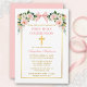 Elegant Watercolor Pink White Floral First Holy Communion Invitation includes pink roses, white flowers and greenery. Gold Cross. Pink Blush Bow Ribbon. Gold Frame.