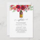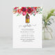 Watercolor floral postponed wedding invitation featuring a lantern and burgundy red and pink roses and peonies.