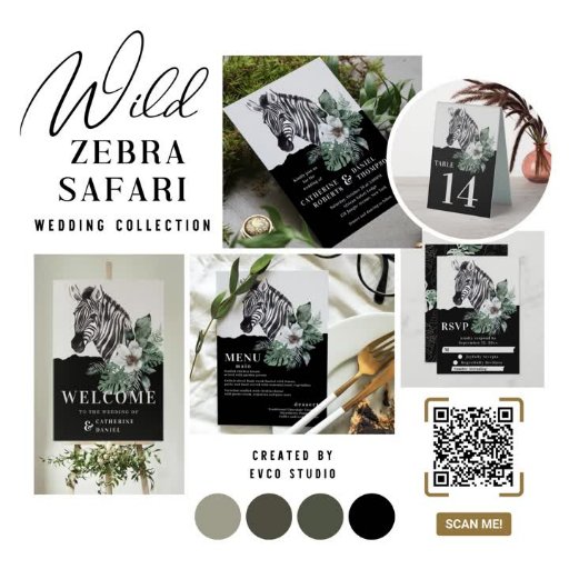 Watercolor Floral Wild Zebra Safari Wedding Invitations features an elegant watercolor wild zebra with watercolor flowers on a black and white background with your Wedding Invitation information below. Personalize by editing the text in the text boxes. Designed for you by Evco Studio www.zazzle.com/store/evcostudio