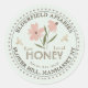 Delicate pink watercolor flowers with little bees on a simple, classy pale sage label. Net wt in oz and grams. Dotted Border.
