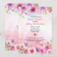 Soft pink and purple flowers are rendered in a watercolor effect against a pink watercolor wash background with subtle paint splatters. Perfect for a pink, watercolor, or garden party themed bridal shower, birthday party, or engagement party. Available with matching products.