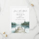 A watercolor forest mountain lake save the date, featuring a serene mountain lake and surrounding pine forest with a dock stretching out into the water. Designed for couples planning a rustic nature inspired or destination wedding. Soft blue and green tones and a clean, airy layout keep the focus on your names, date, and location, creating a refined and timeless feel. A beautiful choice for outdoor ceremonies, lakeside venues, and mountain celebrations, and pairs seamlessly with matching wedding stationery. Available in print, as a digital download, or both.