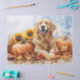 Watercolor art of a golden retriever dog with sunflowers, autumn leaves, and pumpkins.