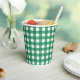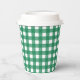 This fun and bright paper cup with lid features a watercolor green and white plaid pattern.