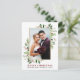 Elegant Watercolor Winter Greenery Merry Christmas Wedding Photo Newlywed Holiday Postcard includes eucalyptus leaves and red holly berries. Gold Frame.