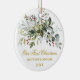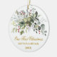 Modern Elegant Watercolor Greenery Couple Our First Christmas Ornament includes beautiful watercolor botanical greenery, eucalyptus leaves, holly berries and other beautiful foliage. Gold Script. Photo Back.