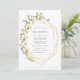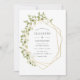 Trendy sage green and white watercolor leaves wedding invitation with gold geometric frame.