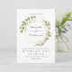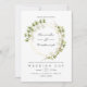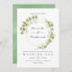 Trendy sage green and white watercolor leaves wedding invitation with gold geometric frame.