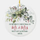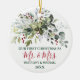 Modern Elegant Watercolor Greenery Couple Our First Christmas as Mr. and Mrs. Ornament includes beautiful watercolor botanical greenery, eucalyptus leaves, holly berries and other beautiful foliage. Red and Forest Green Script.