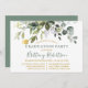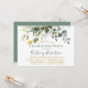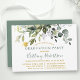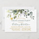 Modern Elegant Watercolor Greenery Graduation Party Invitation includes eucalyptus leaves, green botanical foliage, dusty blue leaves and other beautiful botanical greenery. Trendy Calligraphy Script. Gold Grad Cap. Sage Green Back.