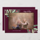 Happy Holidays one photo Christmas card with hand-drawn watercolor botanical elements and a deep red background.
