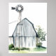 Watercolor Barn I by Jennifer Paxton Parker. Grey-white coloured barn with greenery and a small windmill.