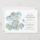Adorable cheerful elephant with pretty blue flowers baby shower invitation for a boys baby shower.
